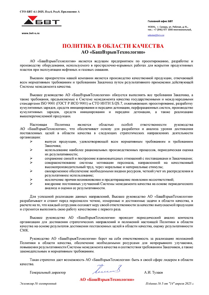 Компания БВТ стремится оставаться одним из лидирующих предприятий в сфере оказания геофизических услуг для промыслового сегмента нефтегазовой промышленности и гарантировать своим Заказчикам высочайшее качество оказываемых сервисных услуг.