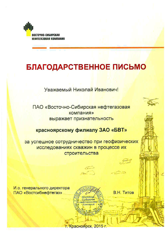 ПАО "Восточно-Сибирская нефтегазовая компания" выражает признательность красноярскому филиалу ЗАО "БВТ" за успешное сотрудничество при геофизических исследованиях скважин в процессе их строительства.