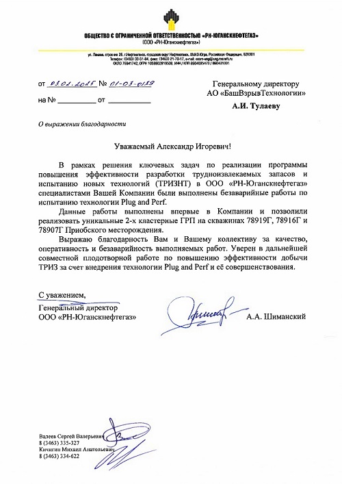 Технология селективной кластерной перфорации Plug&Perf при МГРП с применением полностью импортонезависимого комплекса оборудования АО «БВТ» выбрана ключевым добывающим активом ПАО «Роснефть» - ООО «РН-Юганскнефтегаз» как наиболее эффективный метод при разработке трудноизвлекаемых запасов (ТРИЗ).