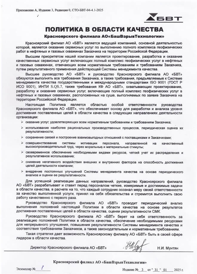 Компания БВТ стремится оставаться одним из лидирующих предприятий в сфере оказания геофизических услуг для промыслового сегмента нефтегазовой промышленности и гарантировать своим Заказчикам высочайшее качество оказываемых сервисных услуг.