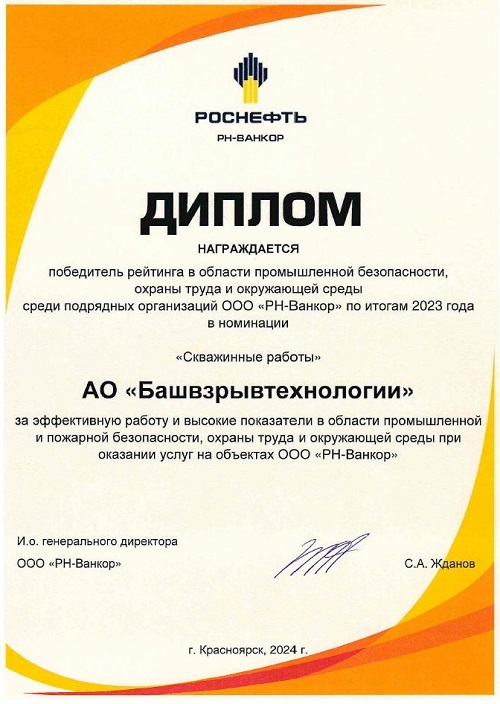 JSC “BVT” has been declared the winner in the rating of industrial safety, health and environmental protection among the contracting organizations of LLC “RN-Vankor” in the Well Works category based on the results of 2023.